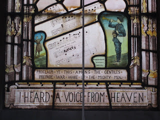 These windows in St Mary's Church at Swaffham Prior show scenes from World War One, including a tank almost identical to that drawn by Bee - sadly, the light shone from behind it and it did not emerge clearly in the photograph I took: